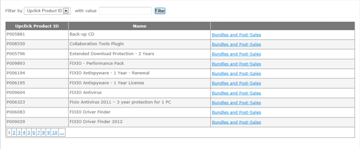 This Bundles and Post-Sales section permits you to manually manage any bundles and post-sales that are accompanied with the UpclickID Product. On each Upclick Product ID, you can click on Bundles and Post-Sales link in order to add or delete a bundle or a post-sale to a Product ID.