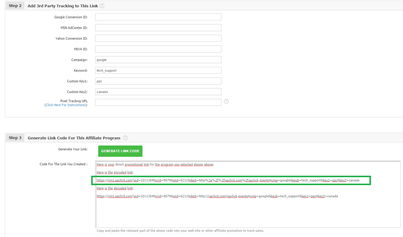 Then in step 3, when you generate your checkout link, your parameters will be added to the link and it will be listed on the Upclick reporting.