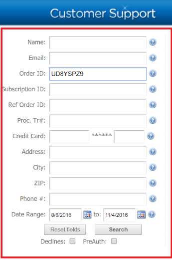 To view the details of a particular order, fill in any one of the fields in the form on the left.