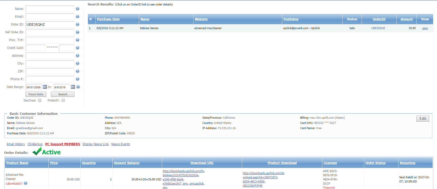 By clicking on the “OrderID” or “View” links, it will display the Basic Customer Information table and the specific Order Details pertaining to that Order ID.